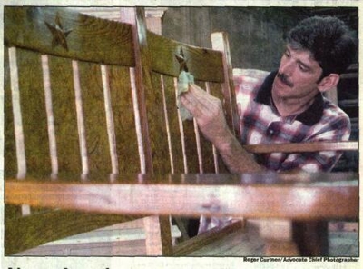 David Clifton, owner of Texana Furniture in Victoria, puts the finishing touches on one of the two benches that will be placed at the Alamo in San Antonio. The pieces were commissioned by the Alamo Committee to provide tourists with restful places to sit. The benches will provide rest for the 2.5 million people who visit the Alamo annually.